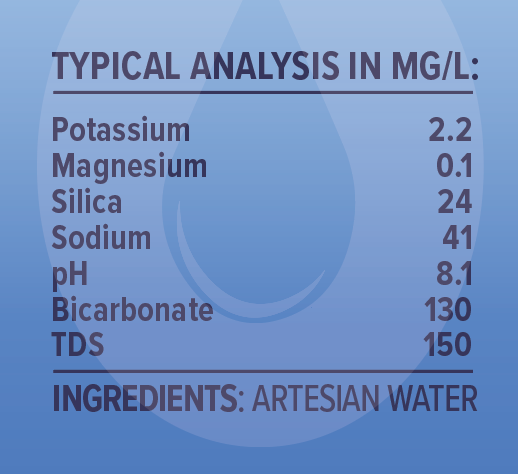 American Artesian Water™ is our premium, domestically sourced, naturally alkaline artesian water. The pH is 8.2 and has magnesium, silica, and other natural minerals.